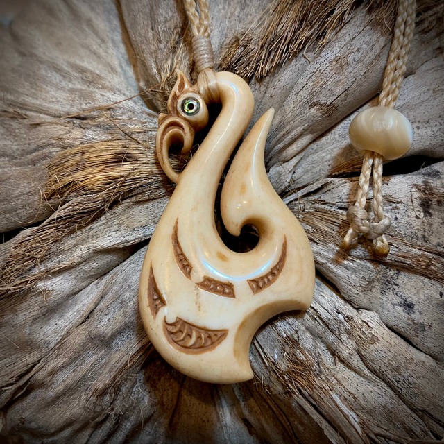 ニュージーランドのマオリ族に伝わる精霊「マナイア」です。マナイアは頭が鳥(空)胴は人(大地)で魚の尾をもつ(海)とされ、その結びつきと調和を象徴しています。また守護霊や魂を導く者とされ、邪悪なものを退けると言われています。 マナイアフックは海を表す魚の尾を釣り針の形に寄せたデザインで、大地を表す胴体にはコル(シダの新芽)の民族模様を彫刻しています。両目には別名ゴッドアイと呼ばれるパウア貝を象嵌しました。 トップサイズ 縦53mm×横30mm×高さ11mm ネックレス紐 素材 ポリエルテルWAX コード(ナチュラル色) 編み 丸4つ組み 太さ2mm 長さ 調節可能(最大67cm) 留め具 夜光貝ビーズ(緑+真珠層) 縦11mm×横11mm×高さ8mm