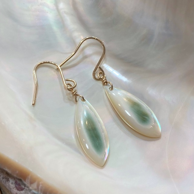 シンプルで使いやすいサイズのピアスです。 表面はふっくら曲面加工で可愛らしく、緑色層と真珠層の両方が楽しめます^^ チャームサイズ 縦20mm×横8mm×厚さ3mm 金属パーツ アメリカンピアス qピン 素材 14kgf