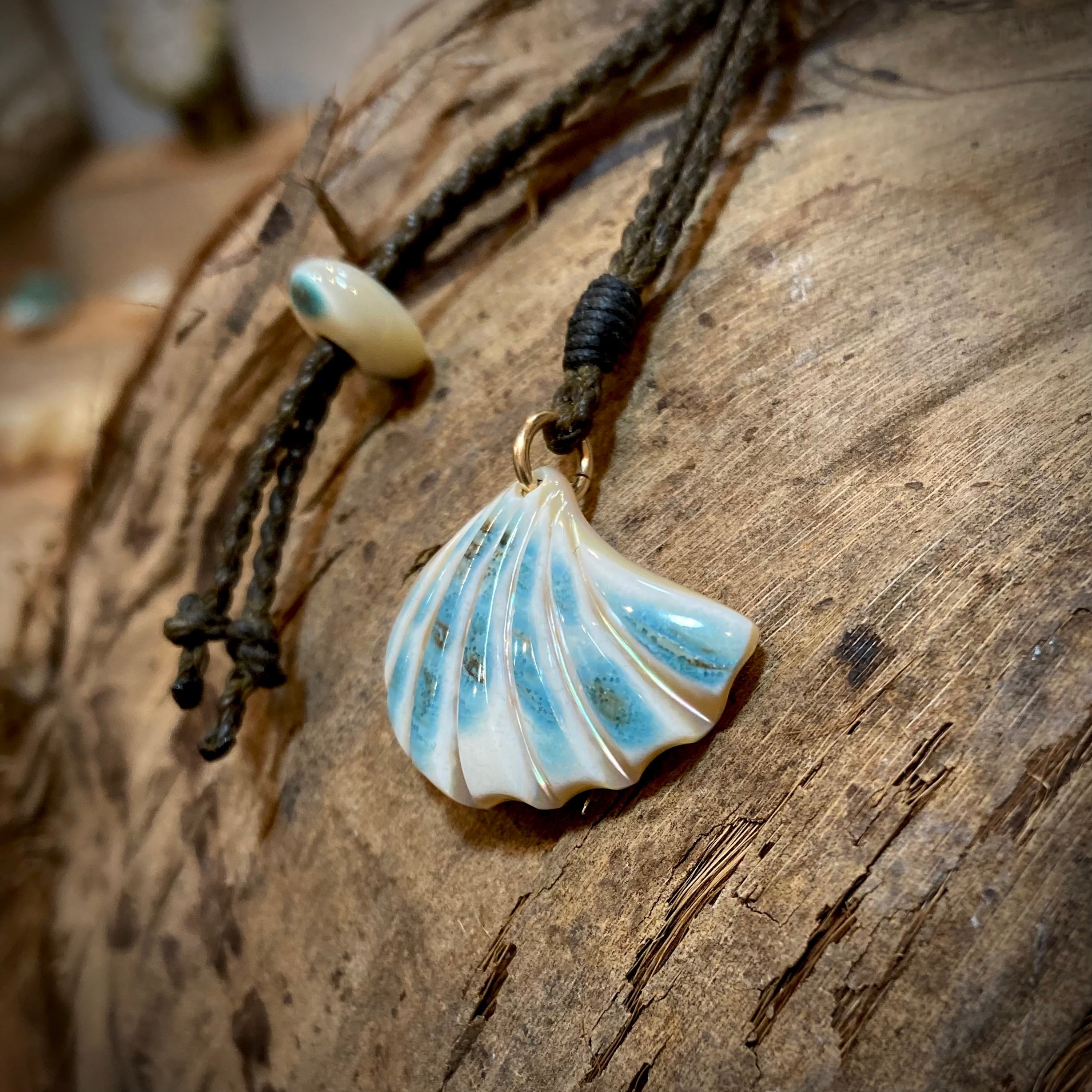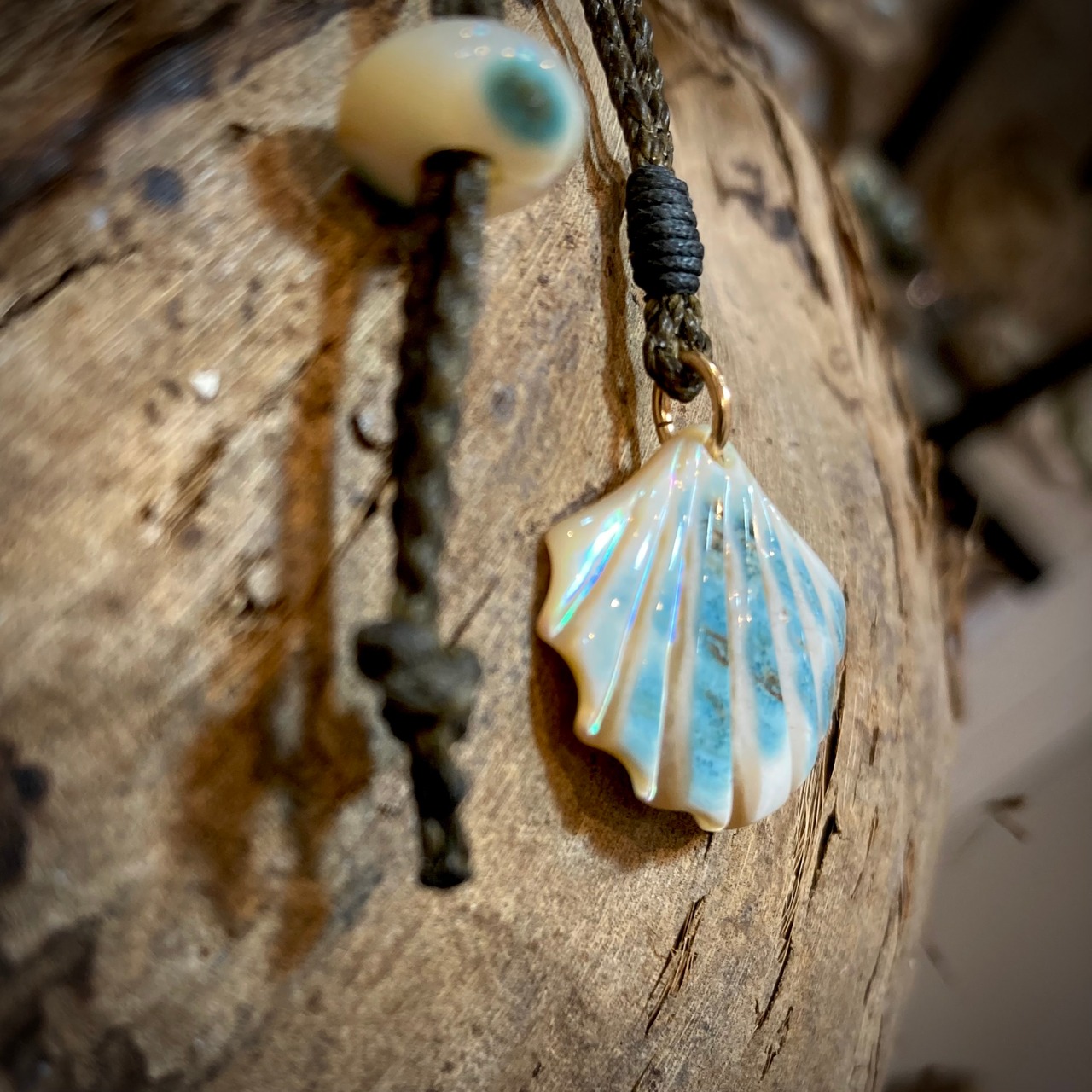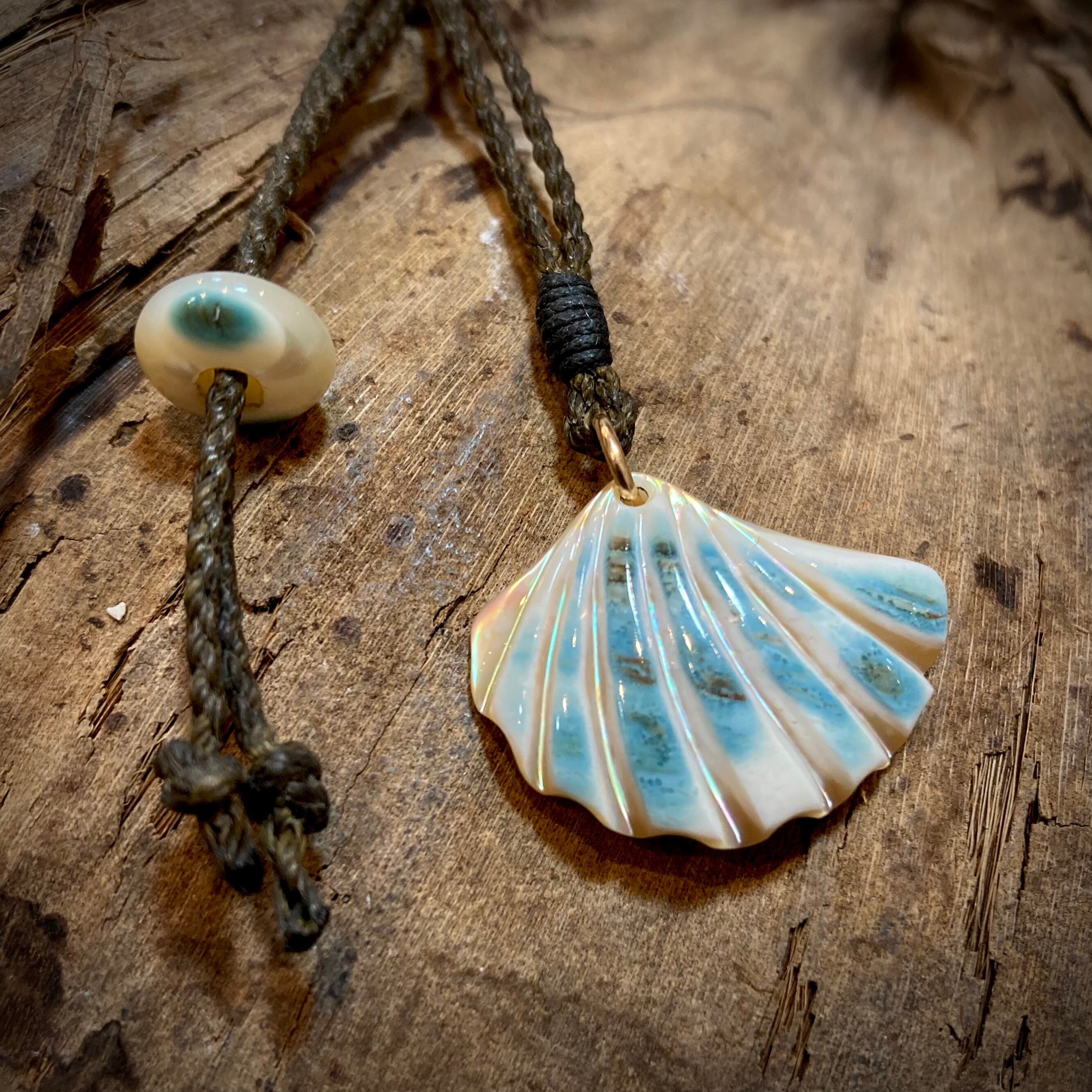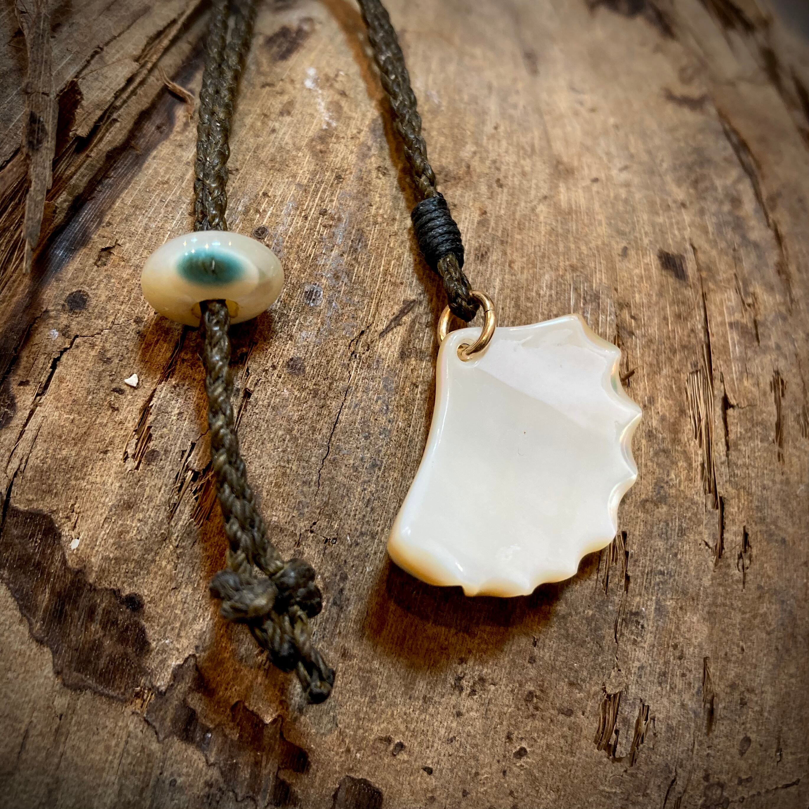 沖縄の民家やアパートの階段などにシャコガイの殻が落ちている事があります。これは捨ててあるわけではなく「あくげーし」と呼ばれる魔除けのお守りです。神聖な力が宿るとされるシャコガイを夜光貝で表現してみました。